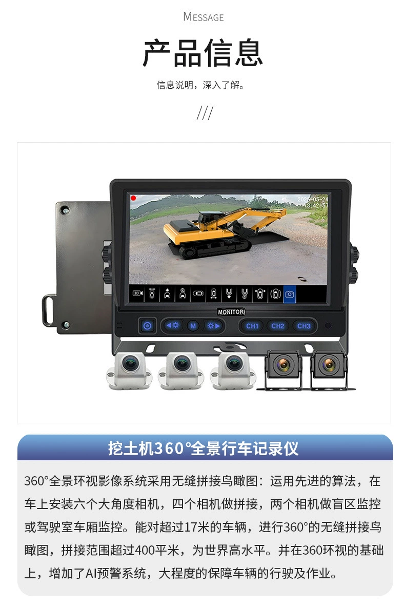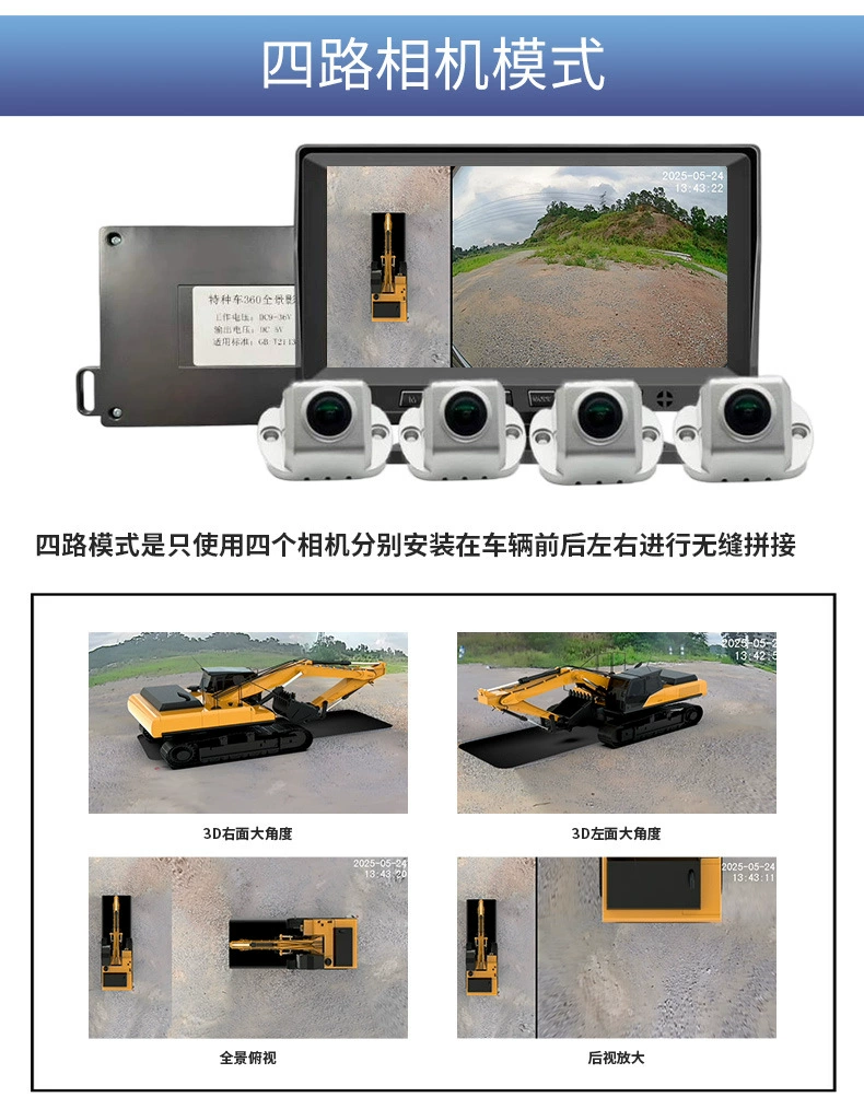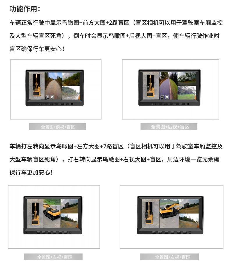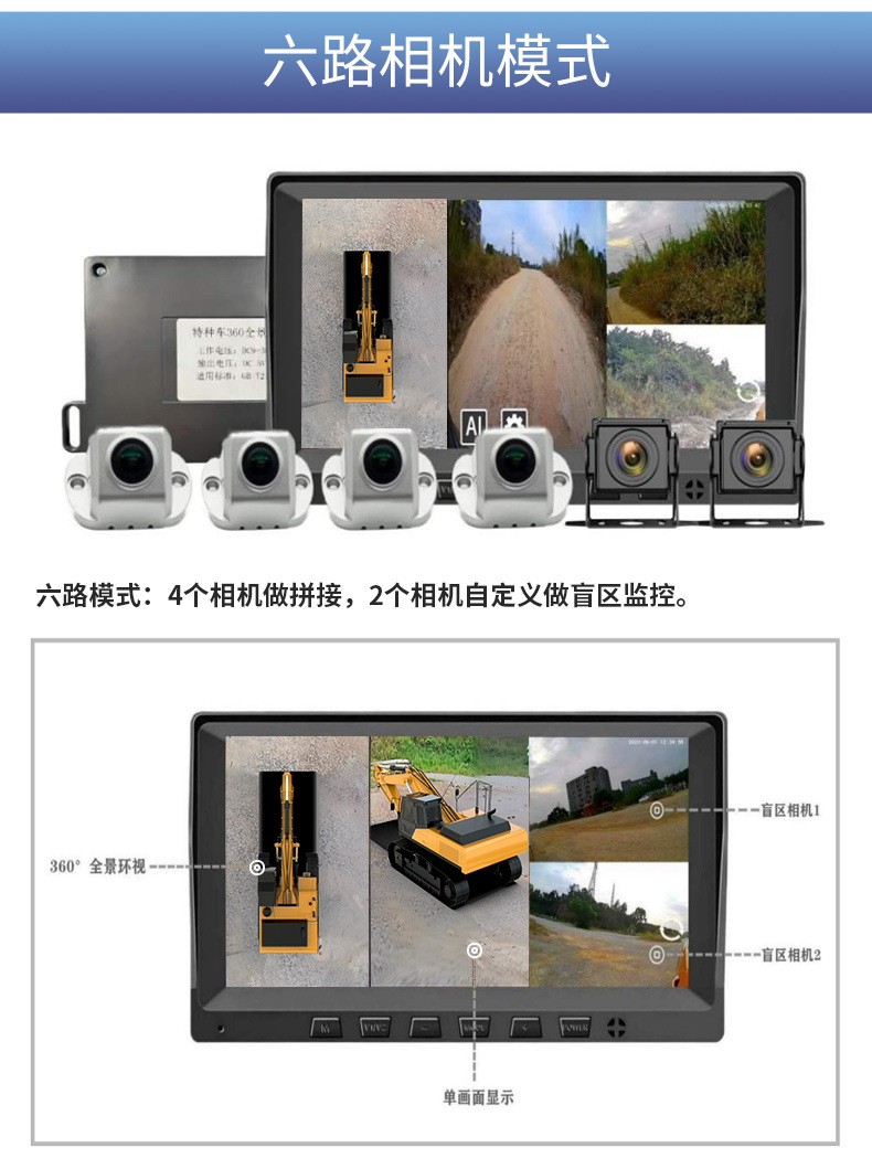 360°全景环视影像系统采用国际领先的视觉算法,通过在车辆关键位置部署六颗超大角度高清相机,构建无死角全景视觉感知网络。其中,四颗相机实时采集周边画面,实现无缝拼接的环视鸟瞰图;另外两颗相机分别负责盲区监测与驾驶室/车厢监控,全面覆盖视觉死角。该系统具备卓越的大车型适配能力,可支持车长超过17米的大型车辆,实现覆盖范围超过400平方米的实时全景拼接,技术性能处于行业领先水平。在全景环视的基础上,